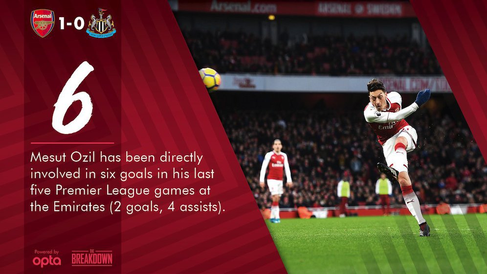 Dengan itu, berarti Ozil telah berkontribusi langsung dalam terciptanya enam gol dalam lima penampilan terakhir di Premier League di Emirates. Kontribusinya tersebut berupa dua gol dan empat assist.